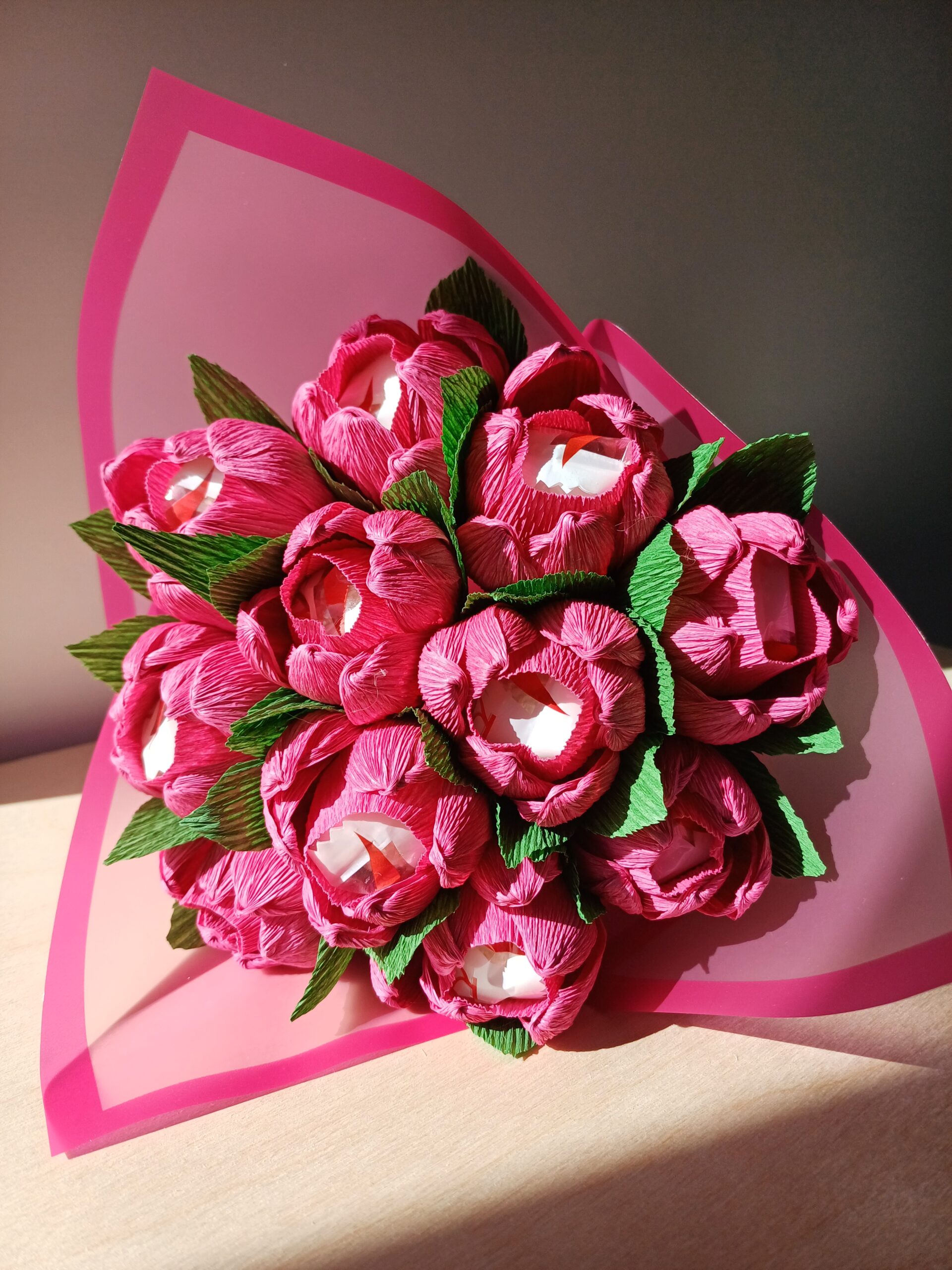 Wyjątkowy bukiet Rafaello z czerwonych tulipanów to połączenie klasycznej elegancji i delikatnej słodyczy. Starannie owinięte oryginalne cukierki Rafaello zostały umieszczone w płatkach bibuły, tworząc uniwersalny, estetyczny i niezwykle efektowny słodki bukiet.