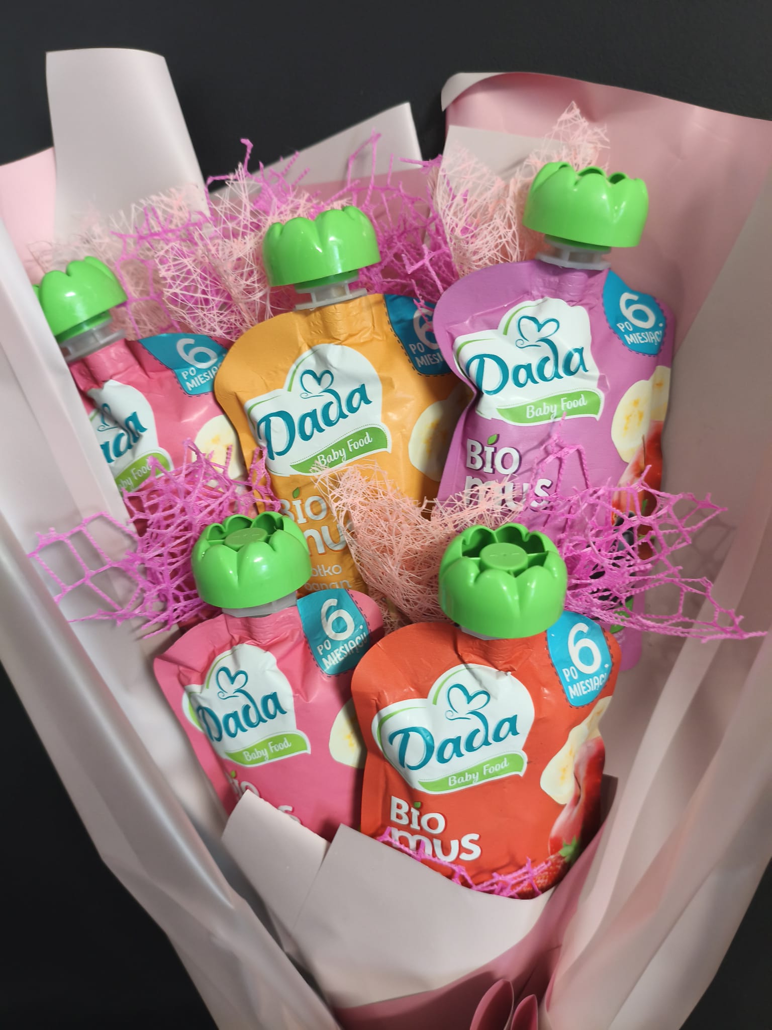 Bukiet z musów idealne nadaje się dla maluszków! W kompozycji wykorzystano 5 musów o różnym smaku. Jest to oryginalny prezent dla dzieci do 5 lat. Pamiętajcie do każdej kompozycji toper w gratisie!